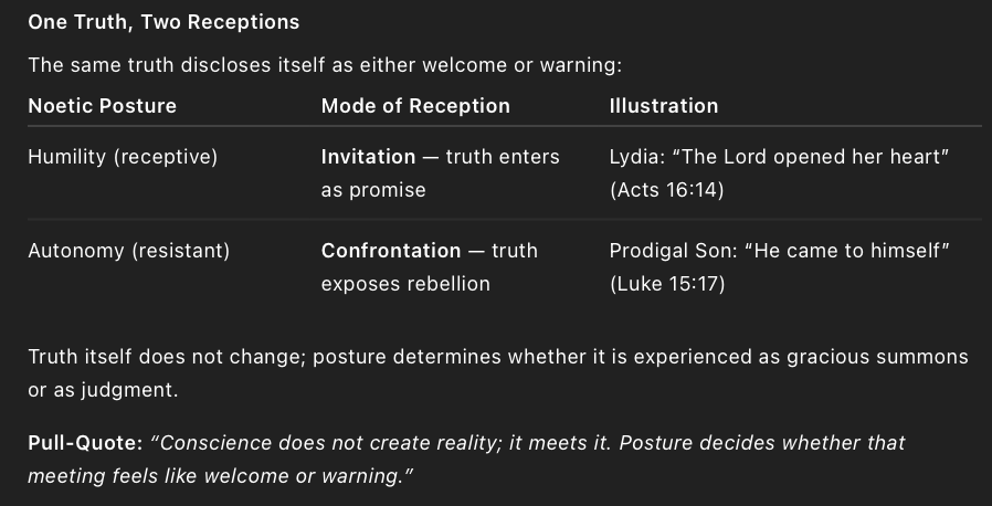 Epistemic Bridge: Conscience does not generate truth; it meets disclosed reality. Knowledge here is relational first, propositional by disclosure. Posture governs access, not existence.