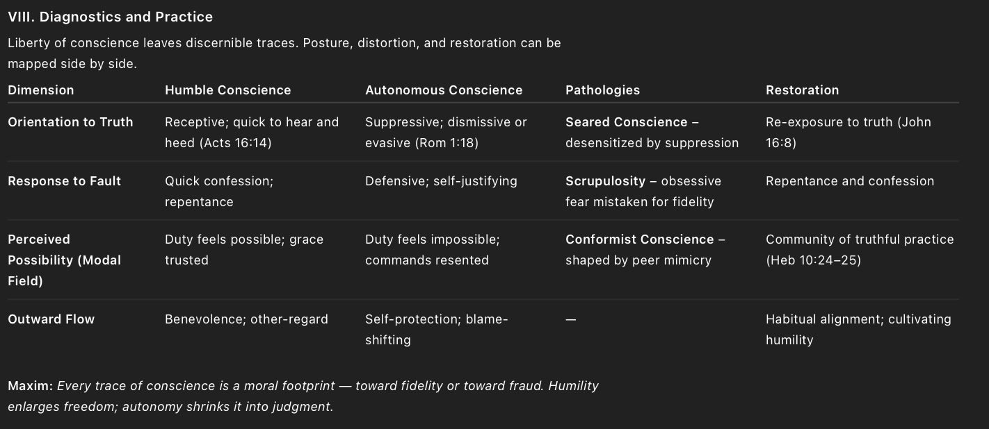 Thus, liberty of conscience is not abstract option but an ontologically structured field where value, duty, and possibility converge. Without it, moral agency would collapse into either determinism or coercion masquerading as grace.