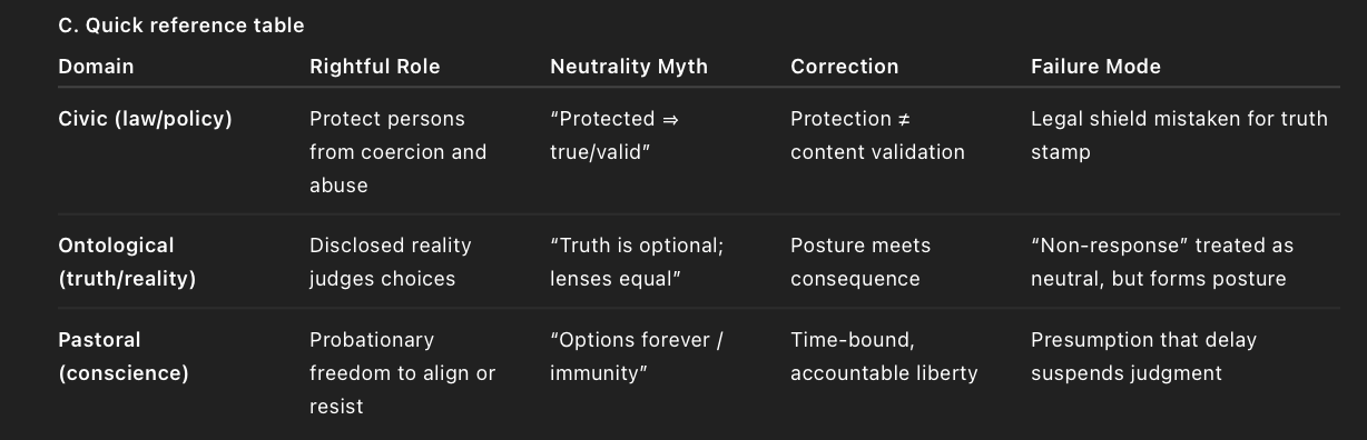 Liberty of conscience is time-bound and accountable. It exists so that posture and allegiance can be revealed without coercion. To infer from civic tolerance that “my choice is therefore neutral” is a category error: protection of persons ≠ validation of propositions (Acts 17:30–31).