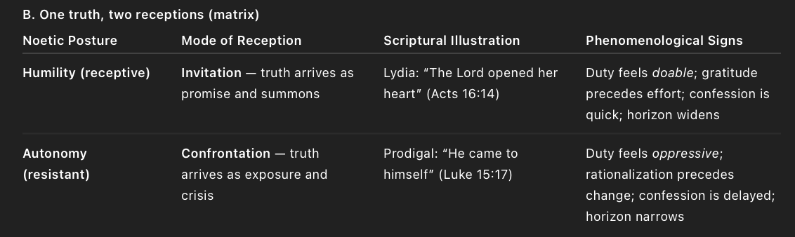 Truth is relationally disclosed and then propositionally articulated. Conscience does not generate reality; it meets disclosed reality (see Moral Collapse and Taxonomic Recovery ). Hence, posture governs access, not existence: humility receives (invitation), autonomy resists (confrontation) (Rom 1:18–21; Acts 16:14; Luke 15:17).