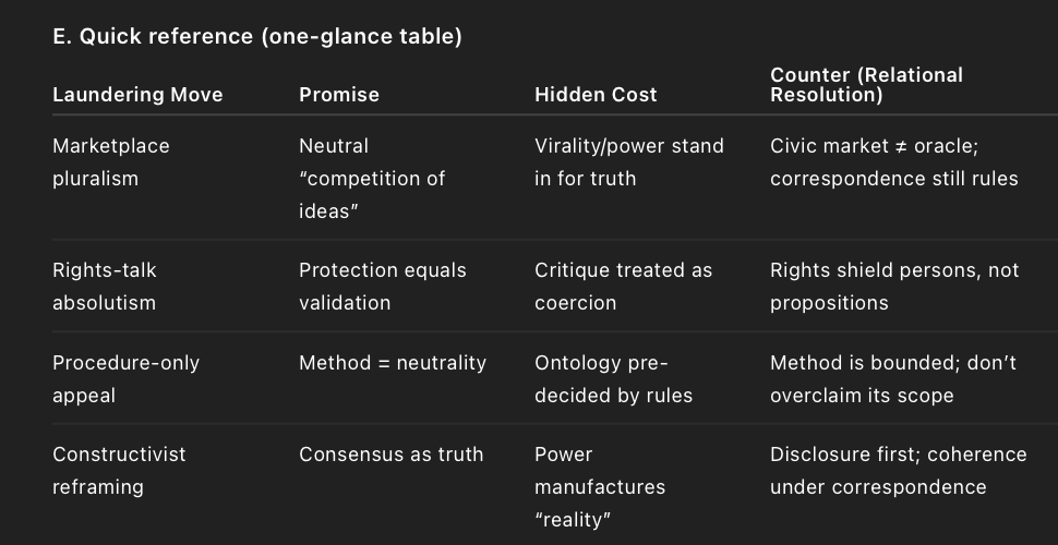 Because posture shapes perception and practice, societies build cover stories to preserve the feeling of neutral choice. Next, we’ll see how “neutral choice” gets laundered—via marketplace pluralism, rights absolutism, procedure-only appeals, and constructivist redefinitions of truth.