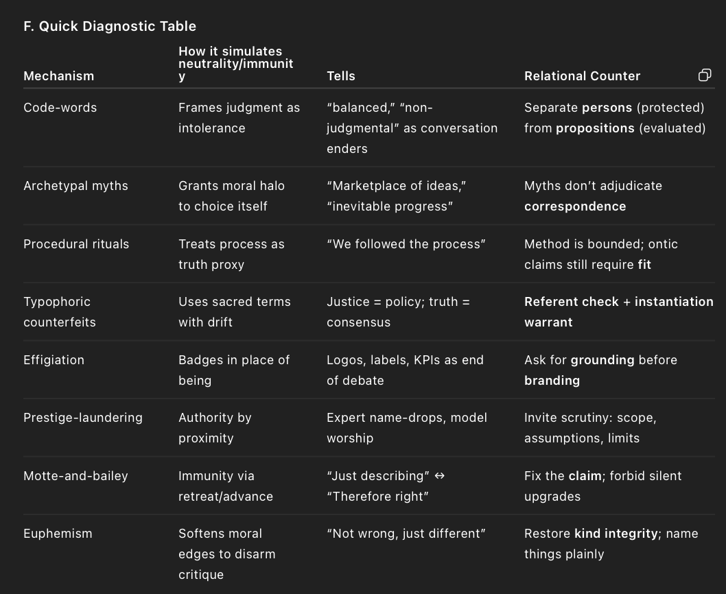 Aim. Keep civic protection strong while pursuing ontological truth. Separate persons (protected) from propositions(evaluated). Make the hidden “neutral choice” moves visible, then invite ordered scrutiny.