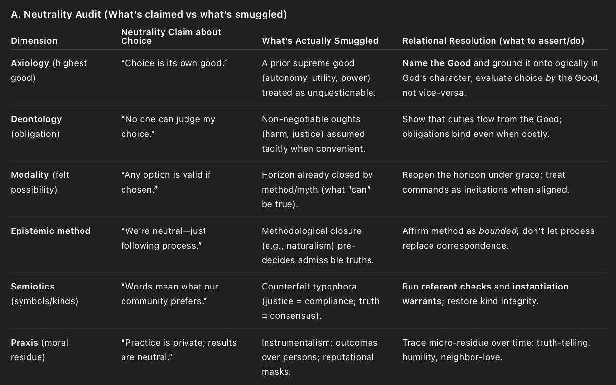 Run the Neutrality Audit and Truth Tests (top-down: disclosure → axiology → duty → modality → semiotics → residue).