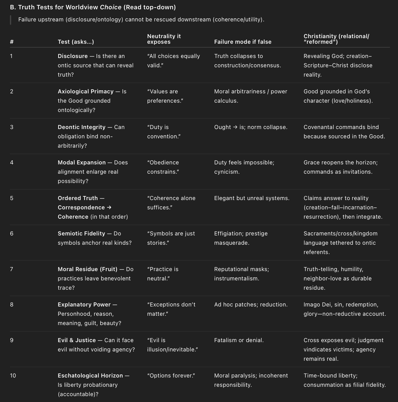 This section helps to test the claims that “my choice of worldview is neutral.” The first table surfaces what’s being smuggled under neutrality talk; the second applies ordered truth tests (correspondence → coherence → pragmatics) and shows, positively, how a relational/“reformed” Christian frame passes.