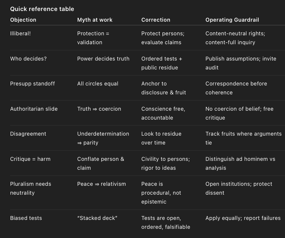 Bridge to next section. With patterns visible, we can now meet the standard objections without collapsing civic tolerance into truth validation: “Isn’t this illiberal?” “Who decides truth?” “Aren’t we in a presuppositional standoff?” “Doesn’t this invite authoritarianism?”