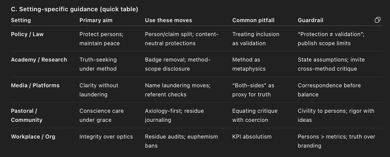 Relational resolution. Honor method as bounded tool; do not let it replace correspondence. Ground the good in God’s character; treat persons as ends, not units. Audit by badge removal: does the argument stand without logos and KPIs?