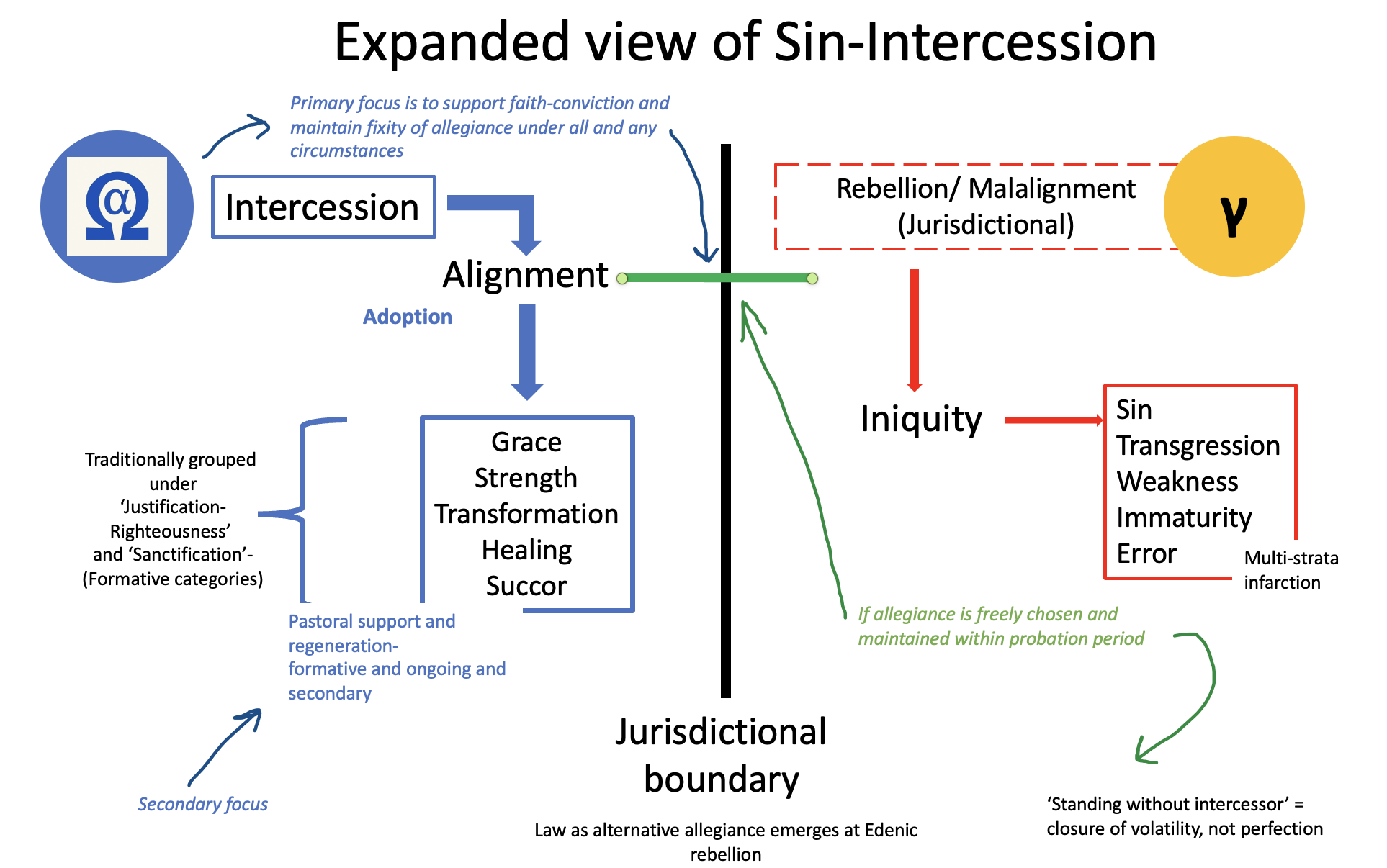 Sin is functionally identified with transgression of law, and intercession is correspondingly reduced to pastoral or remedial support addressing moral failure. Jurisdiction is treated as a static boundary rather than a dynamic category of allegiance, with justification and sanctification bearing the weight of standing.
