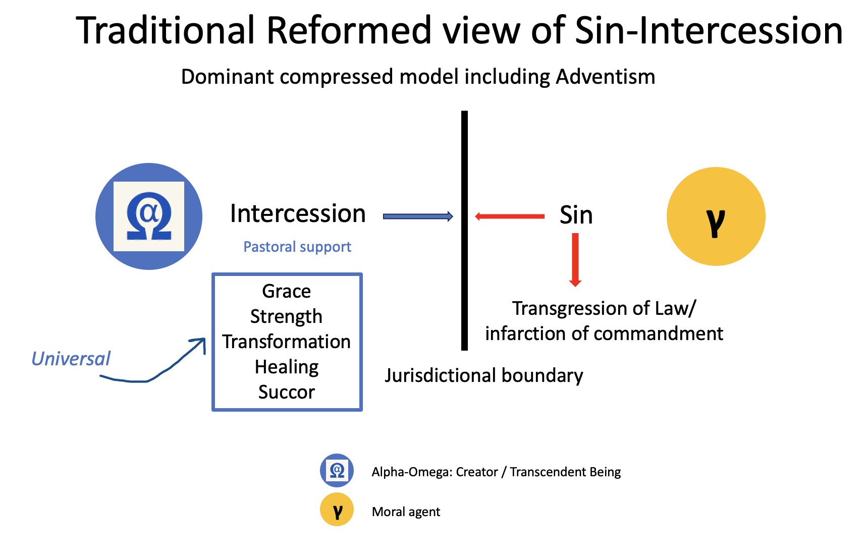 This diagram represents the dominant compressed model of sin and intercession characteristic of traditional Reformed theology and commonly assumed within Adventism.