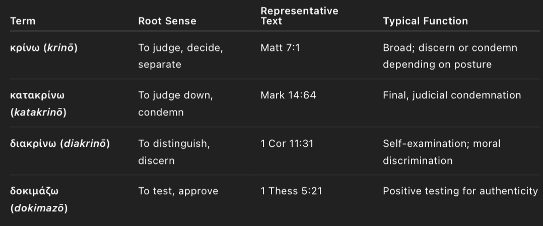 In the Sermon on the Mount, Christ’s use of krinō approaches the condemnatory sense of katakrinō—the usurped act of final judgment. Yet elsewhere believers are commanded to diakrinō and dokimazō: to discern and to test. The issue, therefore, is not the act of judgment itself but the jurisdiction of the judge.