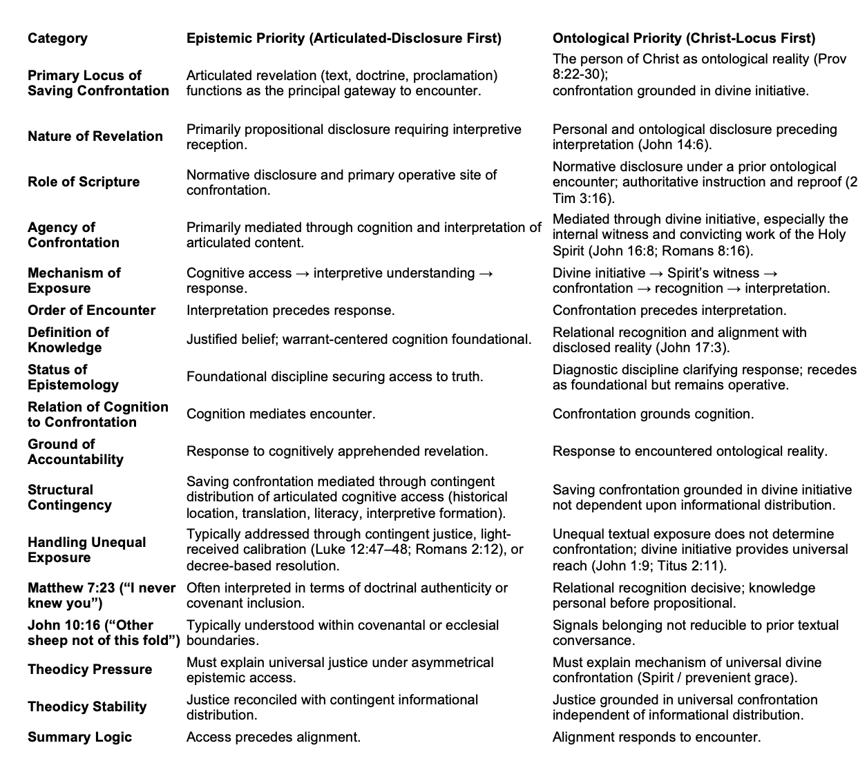 The question is not whether Scripture is authoritative nor whether doctrinal clarity matters. The question is structural: where does saving confrontation become operative? If accountability depends upon contingent epistemic access, theodicy is strained. If confrontation is grounded in ontological disclosure, universal accountability remains coherent.