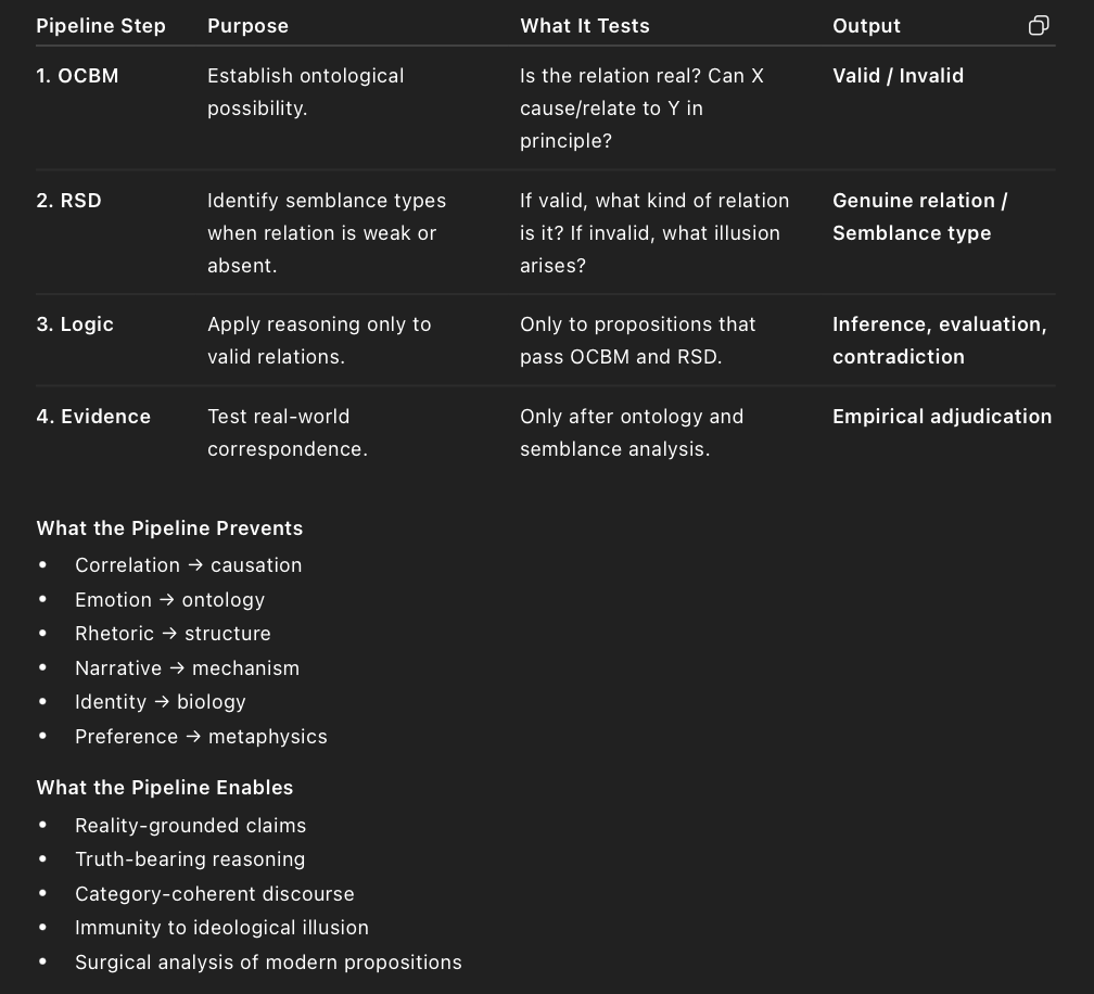 OCBM is the first gate of truth. It establishes whether a statement’s categories are structured in such a way that a relation is even possible in reality. If the categories collapse, mismatch, skip levels, or violate modal coherence, the claim cannot be evaluated logically or empirically because it does not survive the threshold of ontological admissibility.