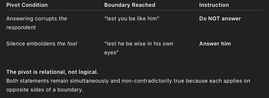 These verses present two instructions that appear contradictory, yet both are affirmed as equally true within Scripture.This makes them an ideal substrate for OCBM’s boundary–pivot evaluation, which identifies the precise threshold at which a relation changes truth-value without collapsing into contradiction or relativism.