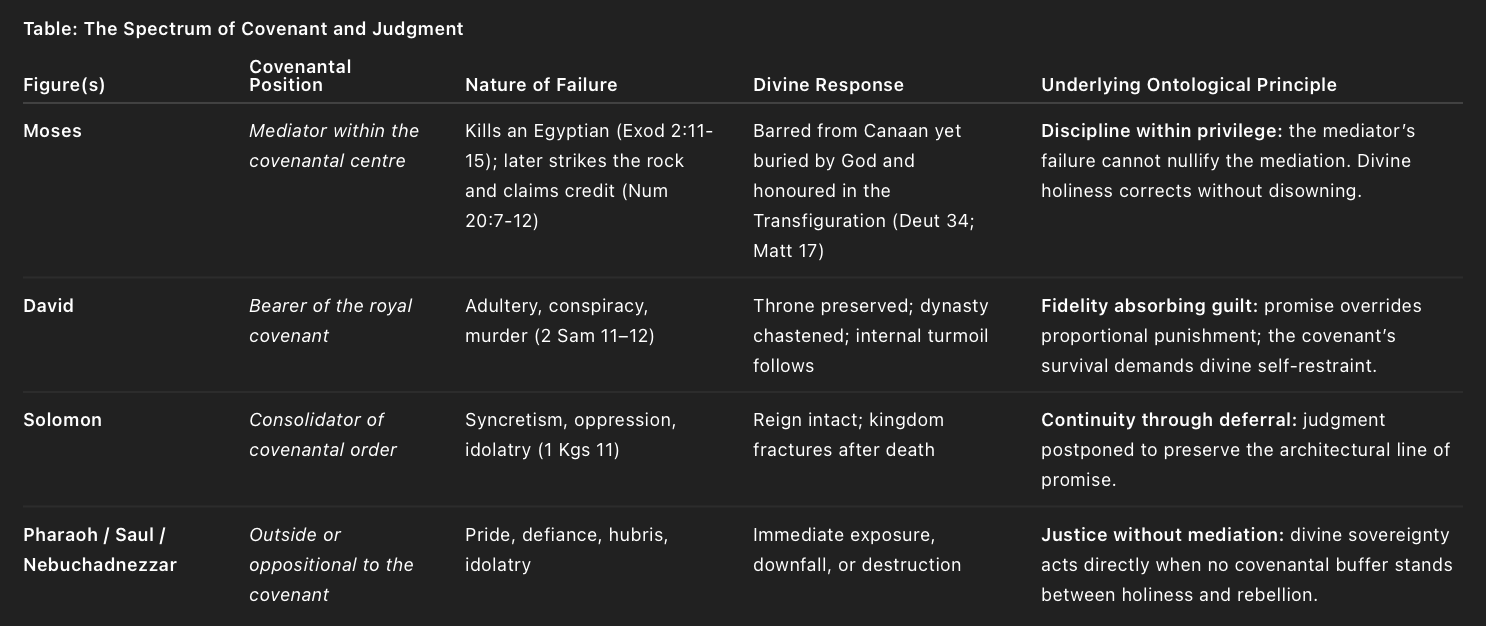 Covenantal incumbency thus creates insulation without exoneration. The nearer the role to the architecture of redemption, the longer God endures its failure for the sake of continuity. Moses is disciplined within intimacy; David and Solomon are preserved within disgrace; Pharaoh, Saul, and Nebuchadnezzar are exposed without buffer.