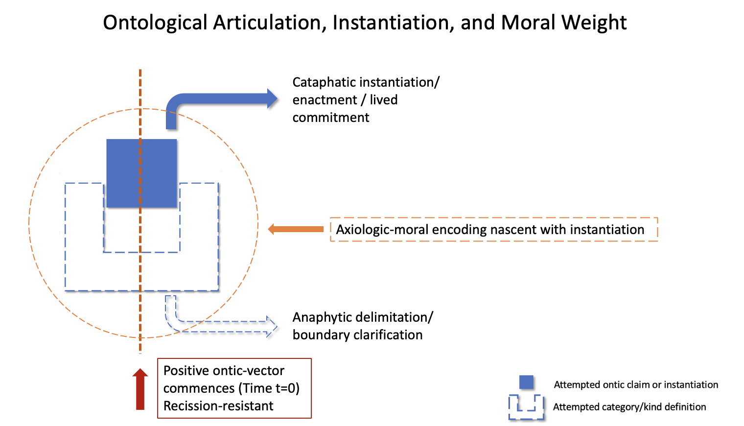 ■ Solid blue block denotes positive ontic instantiation (real enactment of an ontic kind). ▢ Dashed blue block denotes a proposed or delimited category without instantiation. ┃ Red vertical line (Time t = 0) marks the commencement of instantiation, at which axiological–moral encoding is nascently infused. → Solid blue arrow (cataphytic) indicates forward enactment or lived commitment, through which exposure, consequence, and accountability unfold over time. → Dashed blue arrow (anaphytic) indicates ontological syntax and boundary clarification, applicable pre-hoc or post-hoc without enactment. ◯ Dashed orange circle denotes axiological–moral encoding, co-instantiated with the ontic vector rather than temporally subsequent. → Orange inward arrow denotes binding moral weight carried by the instantiated ontic kind.