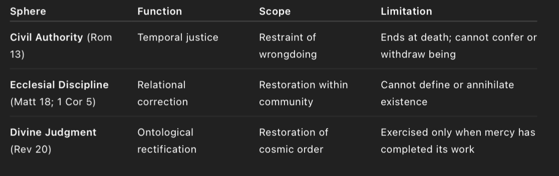 Scripture consistently distinguishes relational boundary from ontological annulment. Human communities may act within the sphere of relationship—correcting, separating, restoring—but never within the sphere of being itself.