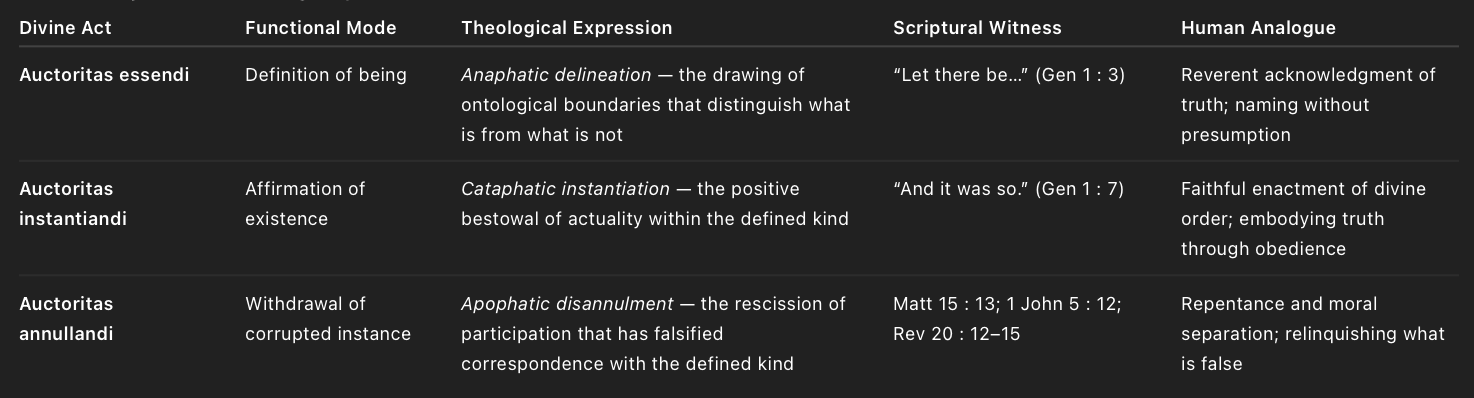 These three prerogatives correspond to the three modalities of divine utterance: anaphatic delineation, by which God defines what is; cataphatic instantiation*, by which He affirms it into being; and apophatic disannulment, by which He withdraws existence that has falsified correspondence with the defined kind. In this act of withdrawal, God does not destroy the kind itself—definition remains inviolate—but removes the corrupted instance that has ceased to participate in truth. Annulment therefore purifies ontology rather than negates it: it rescinds the counterfeit without erasing the category, restoring creation to correspondence with its archetype.