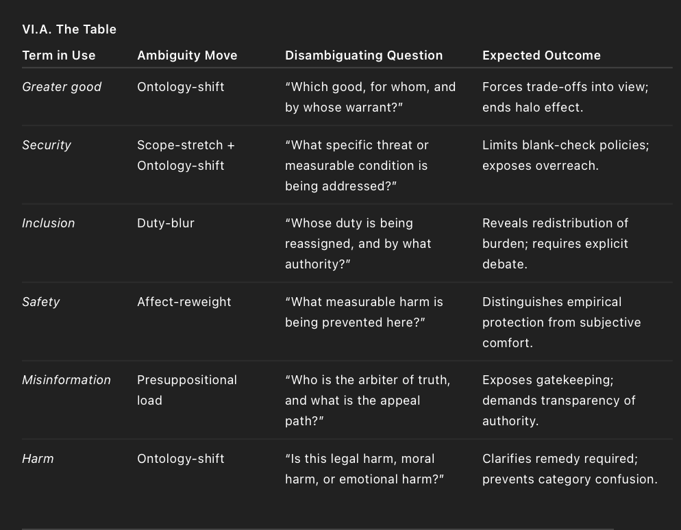 The tools offered — the Disambiguation Protocol, the Micro-Case Study of security, the Naming → Neutralization Table, and the metrics of Warrant Visibility and Referent Specificity — are designed for field use. They allow ambiguity to be scored, challenged, and neutralized.