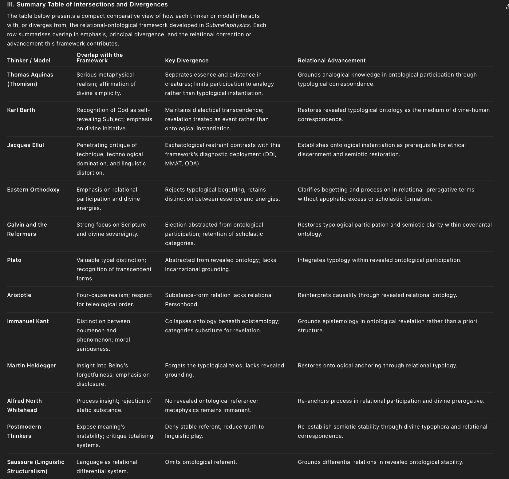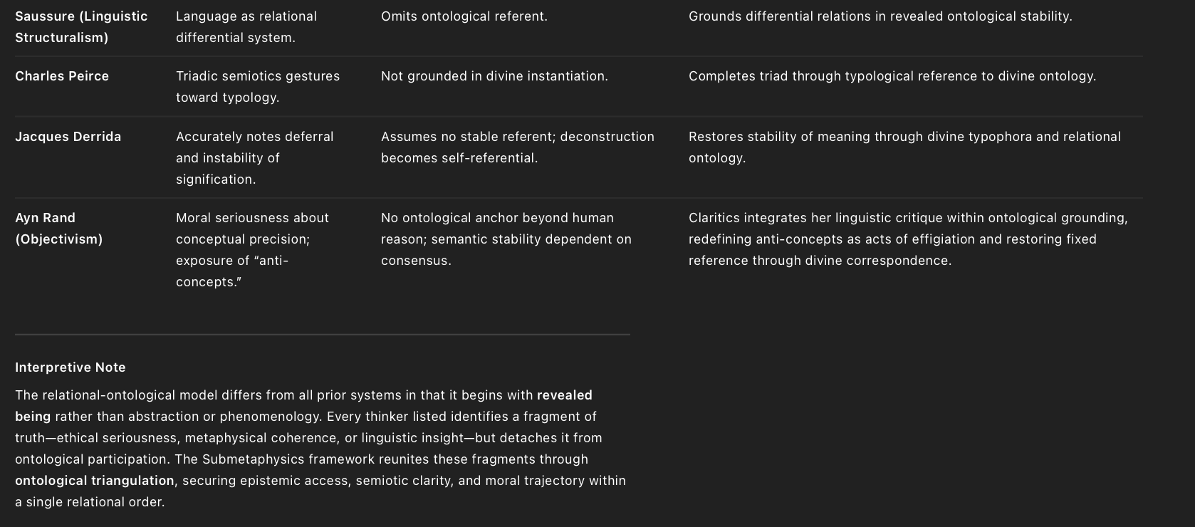 This appendix exists not merely to trace historical ideas or compare theological frameworks, but to clarify this framework’s distinct position and prevent misclassification. Each thinker or model is assessed through ontological triangulation, a method that evaluates proximity to relational-correspondent truth. This involves examining four critical dimensions:
