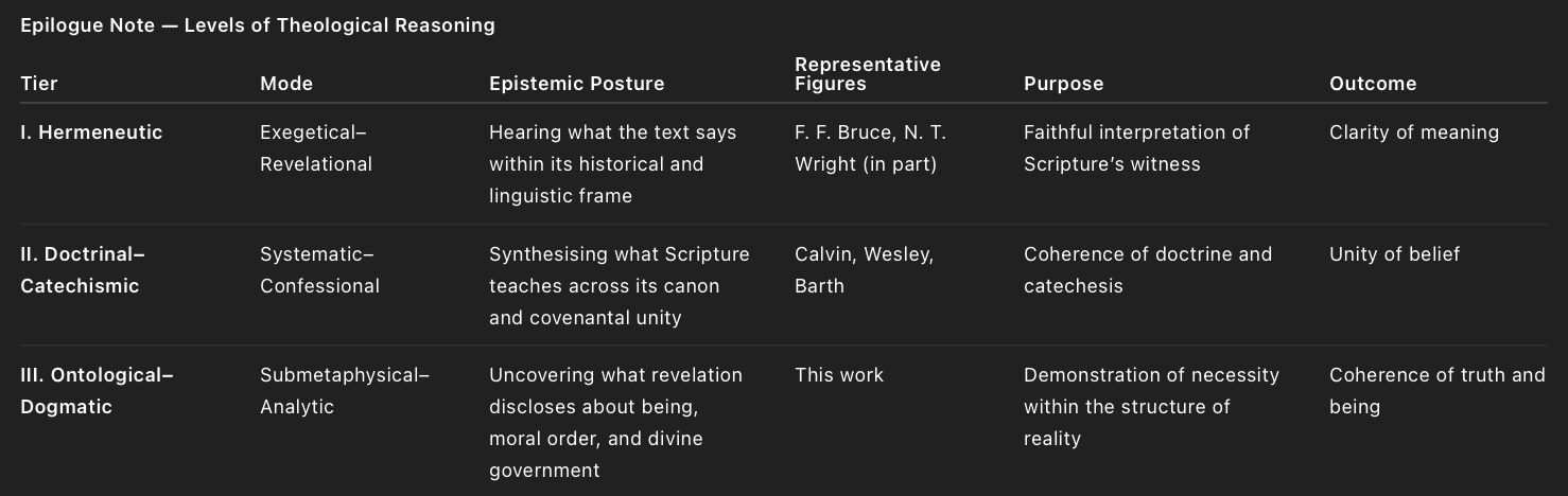 This study operates at the third tier. It presupposes the hermeneutic and doctrinal labours of earlier levels but moves to a dogmatic ontology—showing not only what is true, but why it must be so. The exegete hears revelation; the theologian systematises it; the ontologist discloses its structural inevitability. Thus, the argument that Christ had to die is not speculative metaphysics but the final articulation of revelation’s own inner logic—where Scripture’s moral realism becomes ontological necessity.