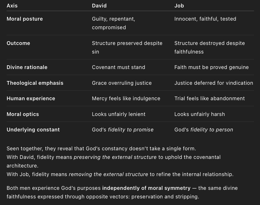 In David, faithfulness takes the form of architectural preservation; in Job, it takes the form of relational stripping. Grace works outward in the king and inward in the sufferer. To David, divine constancy feels indulgent; to Job, it feels cruel. Yet each demonstrates the same ontological symmetry: God remaining true to Himself even when fairness collapses in human sight. The nearer one stands to the covenant’s centre, the longer the patience of God endures; the farther one stands, the swifter His holiness acts.
