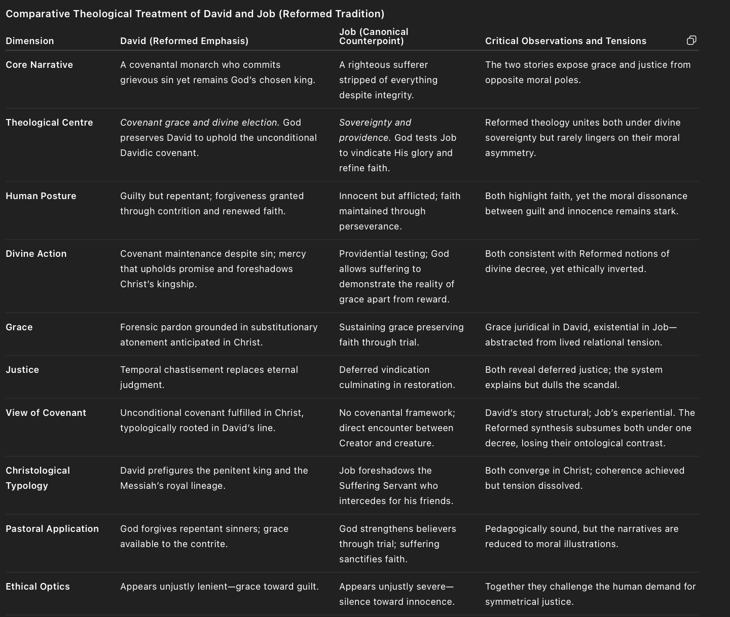 The following comparative section situates this essay within the broader theological landscape of Reformed interpretation.Reformed theology, with its robust doctrines of covenant and sovereignty, regards the stories of David and Job as complementary manifestations of divine constancy—one revealing grace through guilt, the other justice through suffering. Both figures are enlisted to illustrate the immutability of God’s will. Yet in achieving doctrinal symmetry, this system often conceals the narrative asymmetry Scripture itself preserves: the scandal that divine fidelity may appear indulgent in one case and cruel in another.