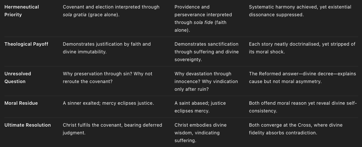 The comparison below does not reject Reformed theology but exposes the ontological core it too easily rationalises—the reality that God’s faithfulness is not a moral balancing act but a manifestation of His being. What unites the two narratives is not psychological experience or moral proportion, but the same ontological constant: divine self-consistency expressed through radically different forms of human fortune.
